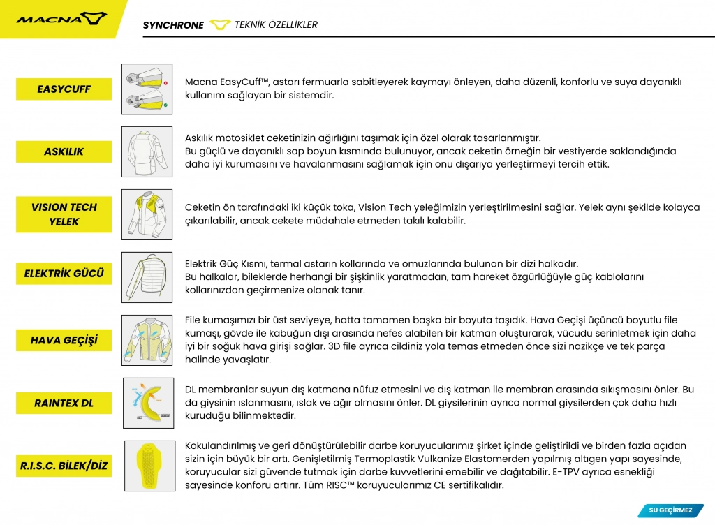 Macna Synchrone motosiklet montu; güvenlik, konfor ve fonksiyonelliği bir arada sunan, dört mevsim kullanıma uygun üst seviye bir sürüş ekipmanıdır. Gelişmiş kumaş yapısı ve CE sertifikalı korumaları sayesinde hem şehir içi hem uzun yol sürüşleri için idealdir.